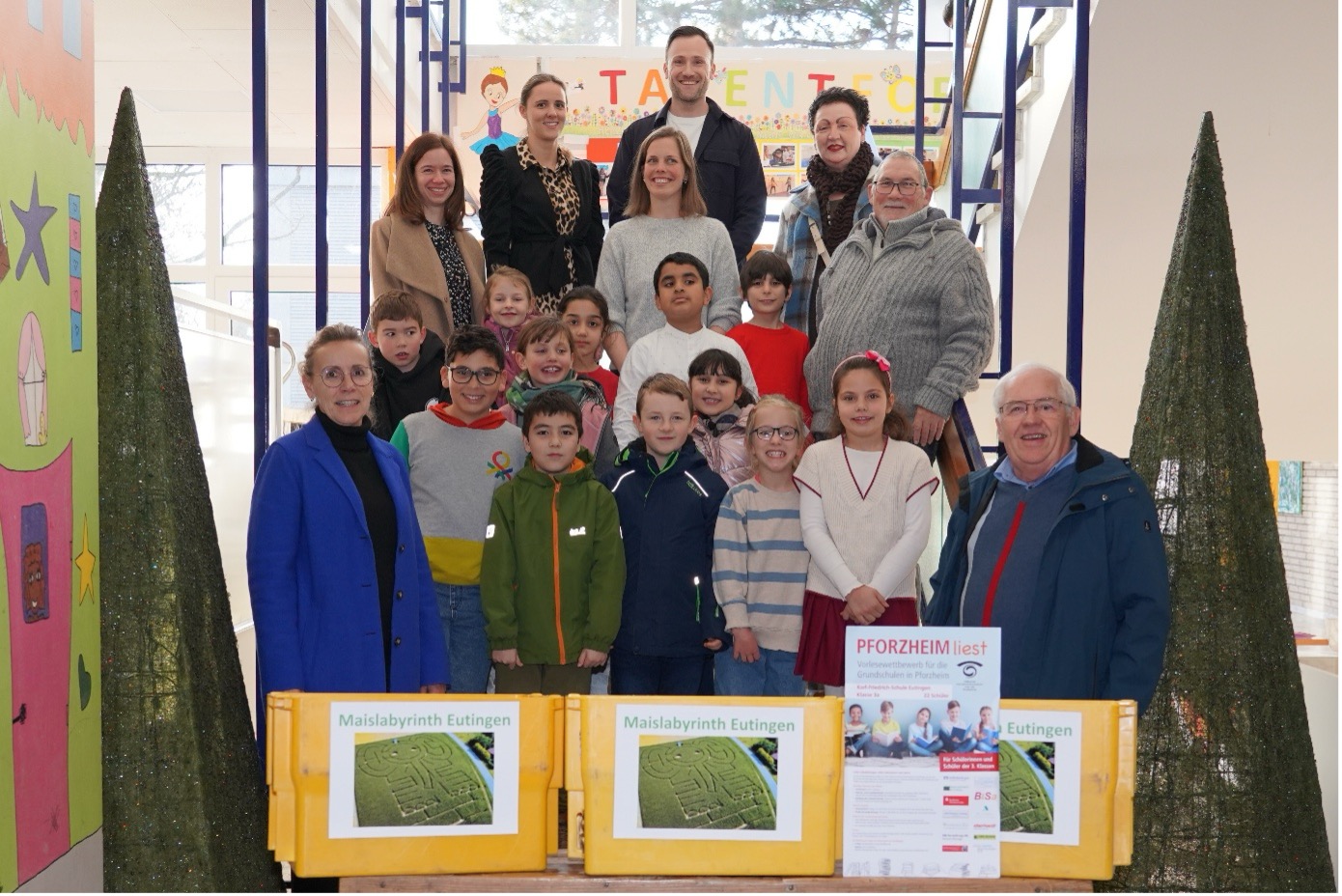 Der Vorlesewettbewerb „Pforzheim liest“ geht in die dritte Runde. Es nehmen alle Pforzheimer Schulen daran teil. Hierzu bekommen alle Teilnehmer der 3. Klassen ein Buch und lesen daraus vor. Der große Zuspruch an der Aktion überstieg die finanziellen Möglichkeiten der Löblichen Singergesellschaft von 1501 und sie suchte finanzielle Unterstützer. Bereits im letzten Jahr unterstützte das Maislabyrinth Eutingen diese Aktion, welche das Selbstbewusstsein und die Ausdrucksfähigkeit fördern. Dieses Jahr sind es in der Karl-Friedrich-Schule Eutingen 4 Klassen mit 86 Kinder, welche durch eine Spende über 1100€ vom Maislabyrinth mit altersgerechten Büchern ausgestattet wurden. Im Rahmen vom Weihnachtsbasar wurde die Bücherspende übergeben.
